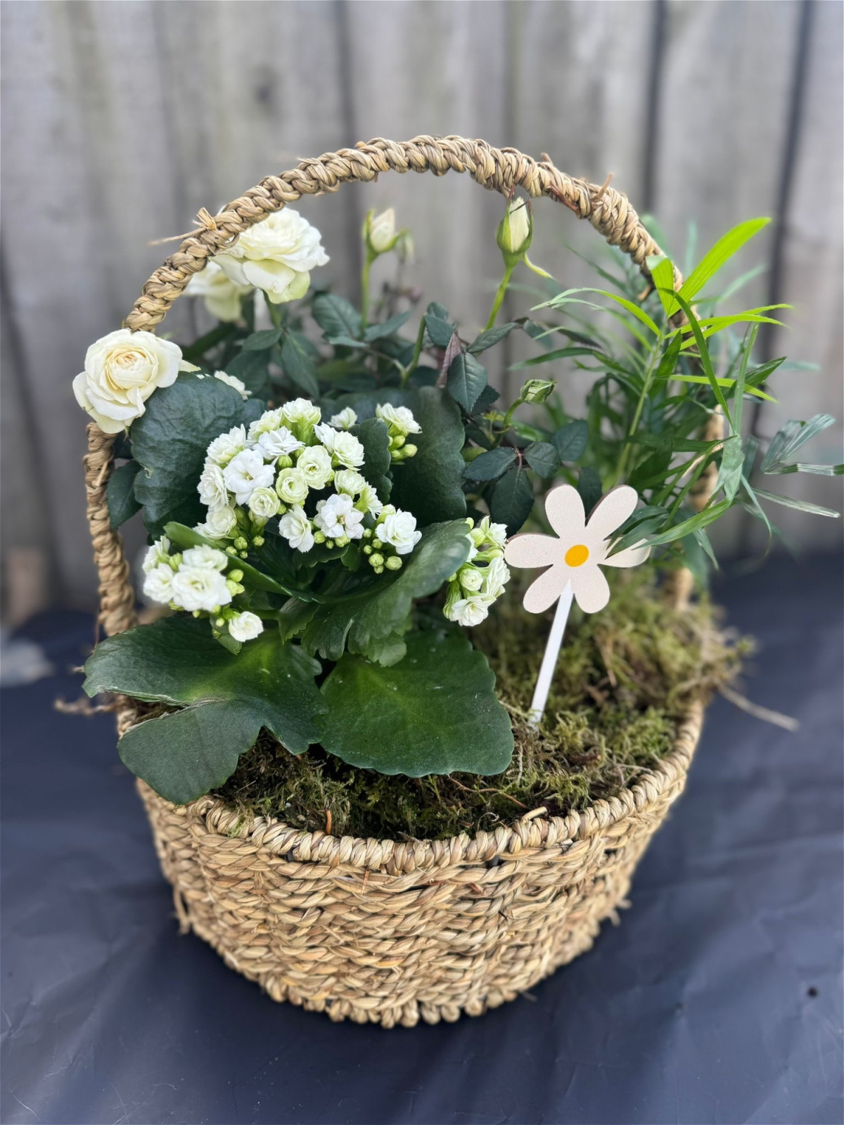 A mixed planters including palm, roses and campanula in a wicker basket